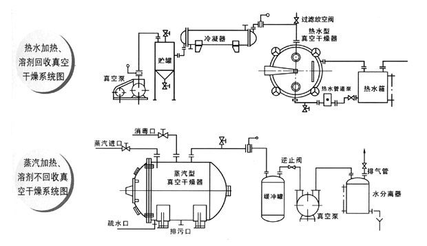 注:如采用冷凝器,物料中的溶劑可通過冷凝器加以回收;如采用SK系列水環真空泵或ZS WJ系列水力噴射真空泵機組,可不用冷凝器,節省能源投資。